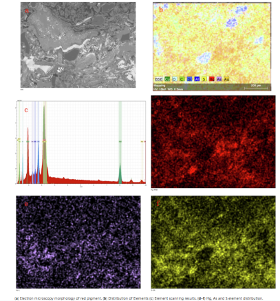 Analysis of the red cinnabar painted layer by Scanning Electron Microscopy with Energy-Dispersive Spectroscopy (SEM-EDS) detected the presence of As within the cinnabar. The distribution area and proportion of Hg, S, and As indicated that this cinnabar was natural cinnabar mixed with arsenic sulfide minerals such as realgar or orpiment (Fig. 3).